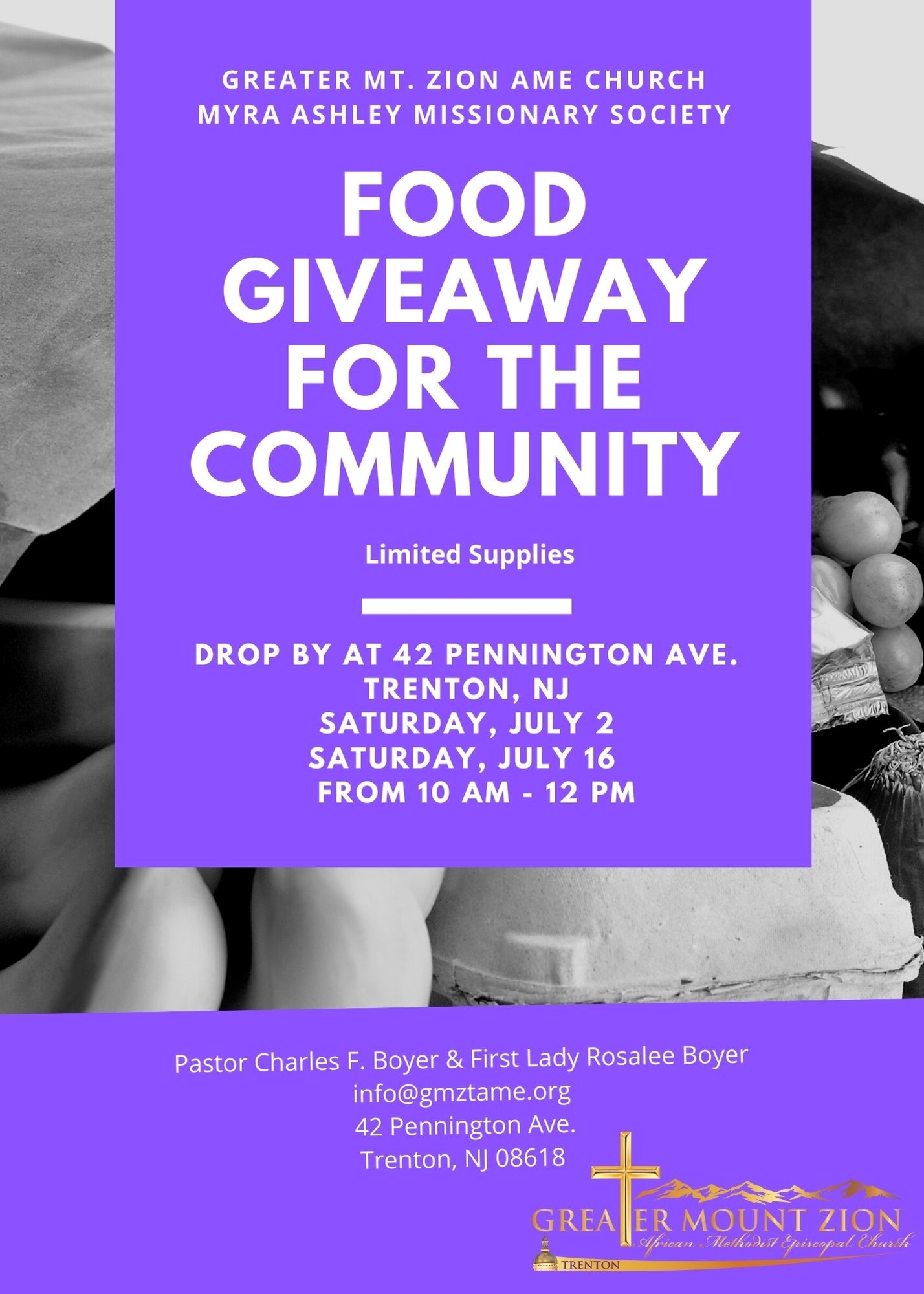 Food Giveaway for the Community Greater Mt. Zion AME Church Myra Ashley Missionary Society Rev. Dr. Charles F. Boyer, Pastor First Lady