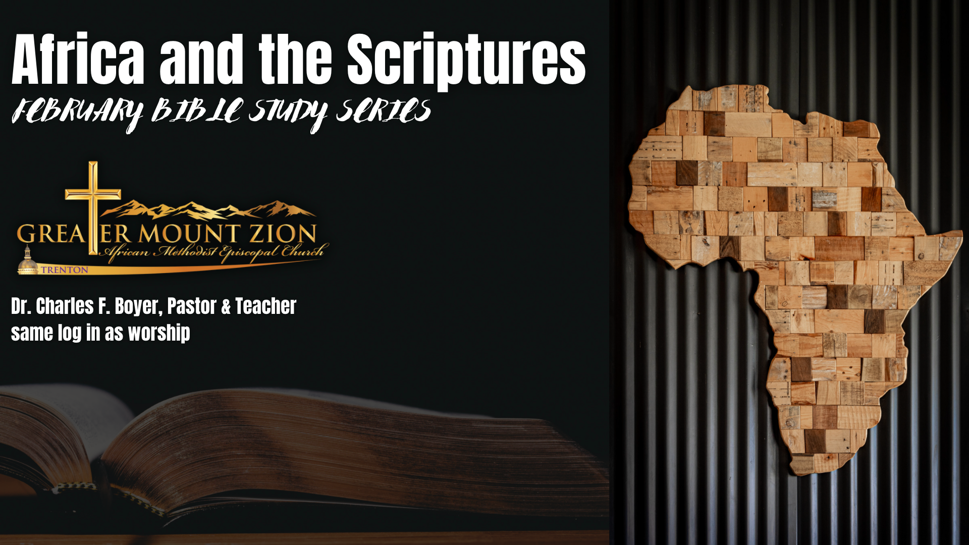 Africa and the Scriptures February Bible Study Series Dr. Charles F. Boyer, Pastor & Teacher Every Wednesday @ 6pm Same login as