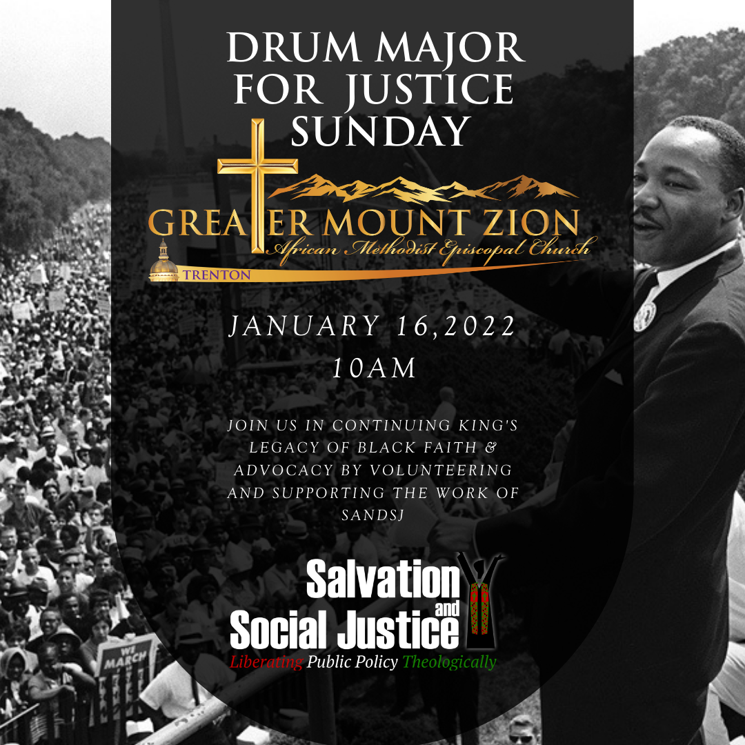 Drum Major for Justice Sunday Salvation And Social Justice: Liberating Public Policy Theologically Join us in continuing King's legacy of Black Faith