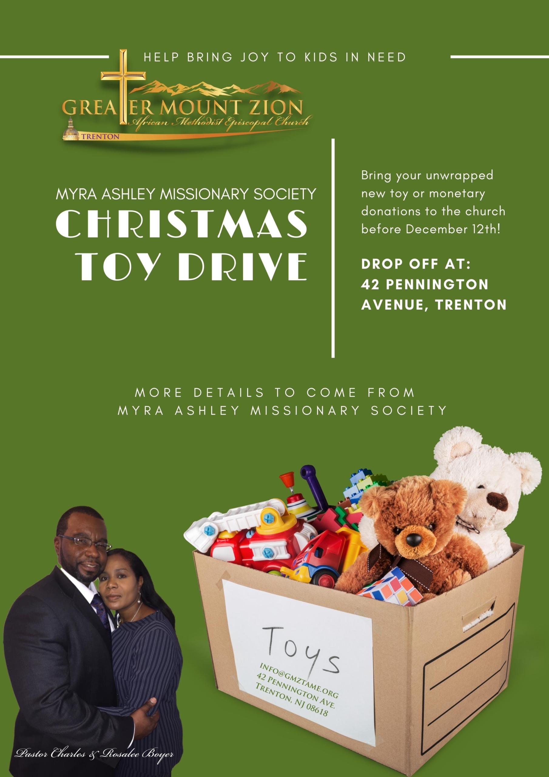 Myra Ashley Missionary Society Christmas Toy Drive Bring your unwrapped new toy or monetary donations to the church before December 12th! Drop